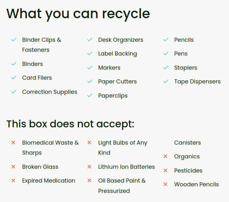 - Office supplies, including pens, pencils (not wooden) and markers in our TerraCycle collection box. See here for exactly which items we accept.